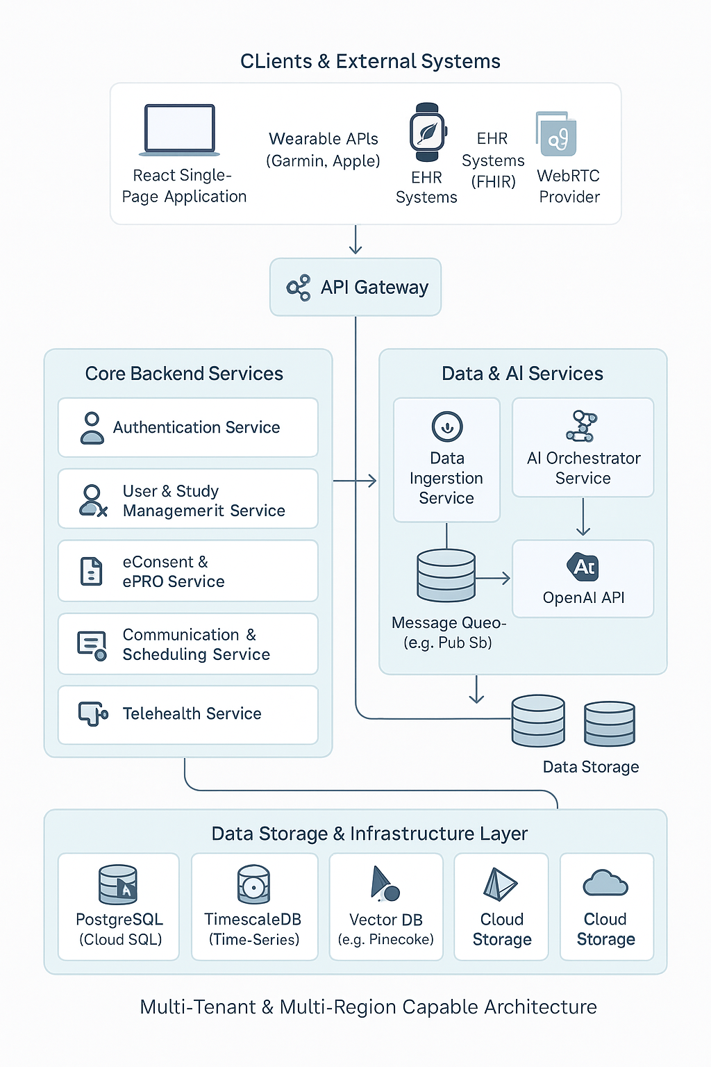 - Foundation (Multi-Tenant & Multi-Region): The architecture is built on a multi-tenant model, where each "Organization" (e.g., a university, a pharmaceutical company) is a secure, isolated tenant. This is deployed across multiple geographic regions to comply with data residency laws like GDPR.
